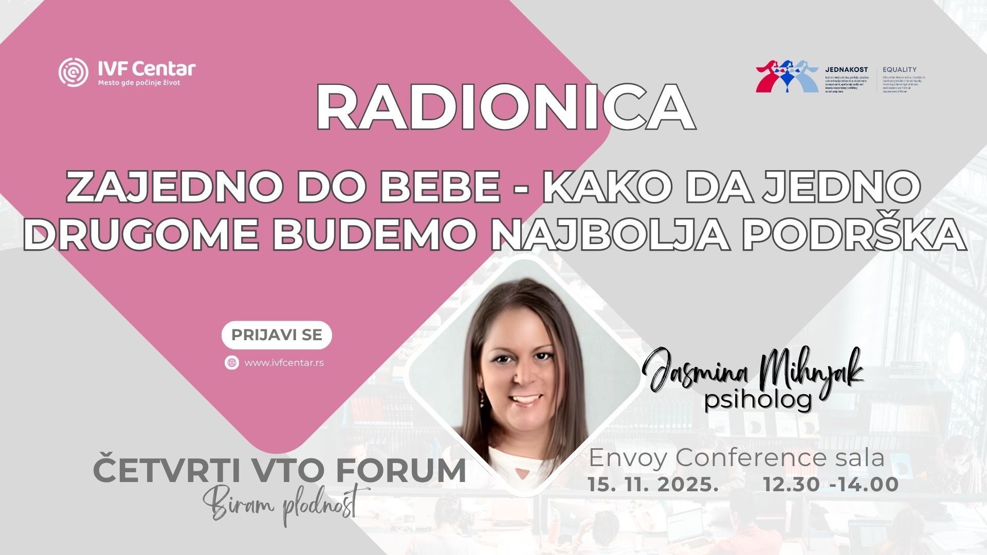 U okviru Četvrtog VTO Foruma, imaćete priliku da prisustvujete radionici na temu „Zajedno do bebe – kako da jedno drugome budemo najbolja podrška “, koja počinje 15. novembra 2025. u 12.30 u Envoy Conference Centru. Prijavite svoje učešće popunjavanjem forme ispod!