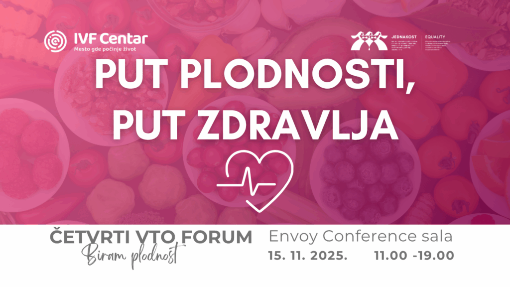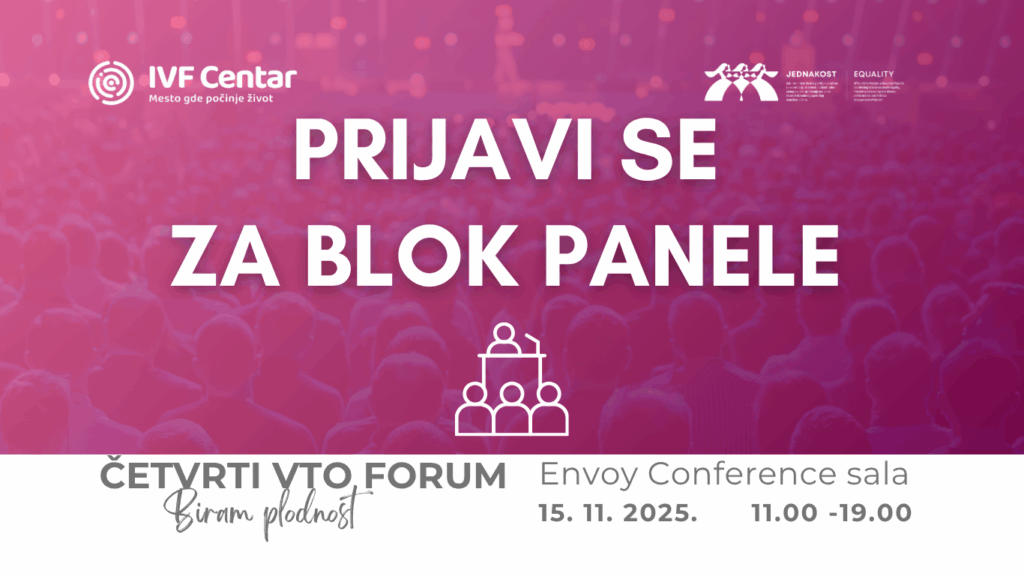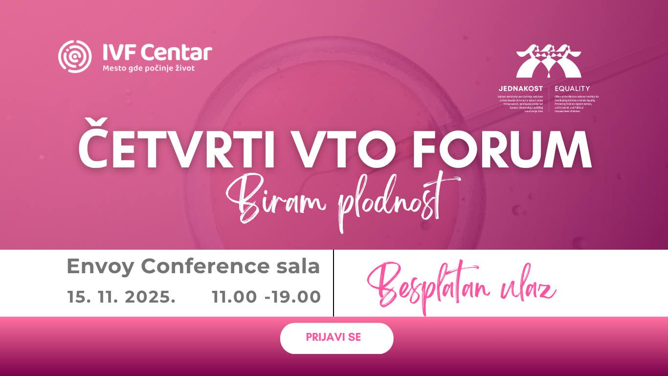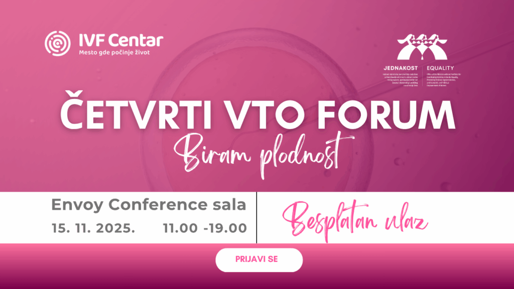 IVF Centar vas poziva na Četvrti VTO Forum pod sloganom Biram plodnost. U pitanju je jedinstven događaj posvećen edukaciji, podršci i informisanju svih onih koji žele da saznaju više o plodnosti i reproduktivnom zdravlju. Forumu će prisustvovati više od 30 stručnjaka iz oblasti reproduktivne medicine i vantelesne oplodnje iz Srbije. Potražite odgovore na sva vaša pitanja u jednom danu! Prijavite se i dođite! Ulaz je besplatan!