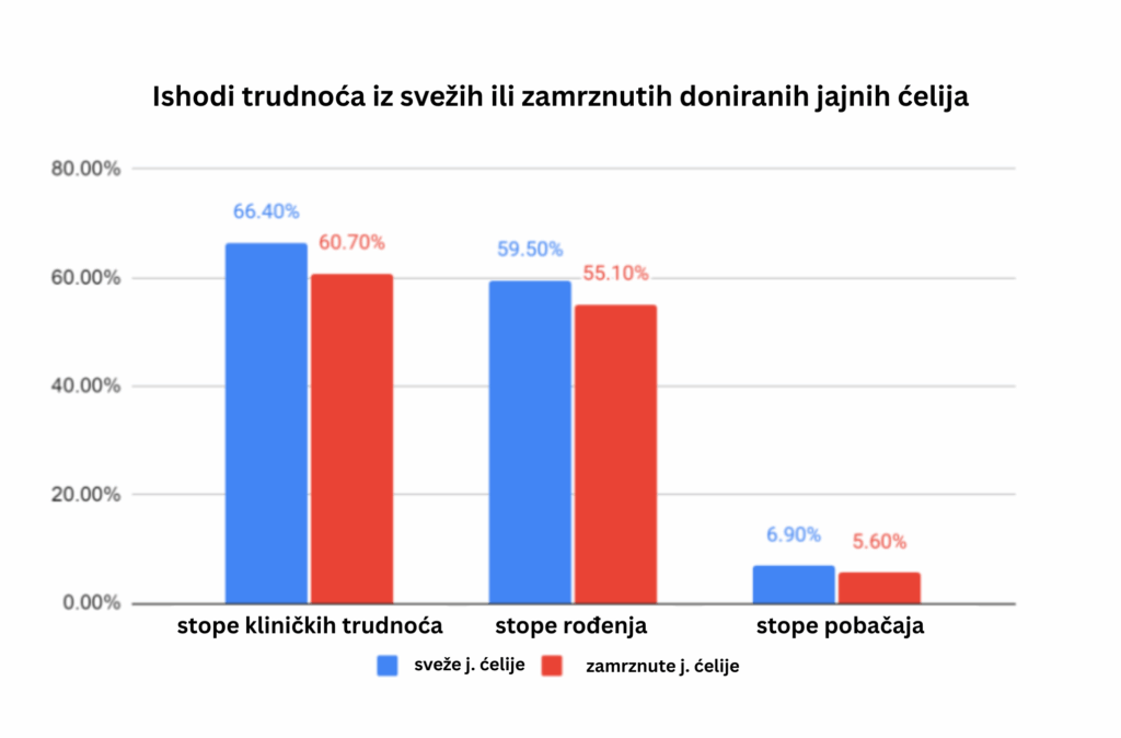 - Nema razlike u stopi živorođene dece, kumulativnih živorođenja, kliničkih trudnoća ni trudnoća u toku.
