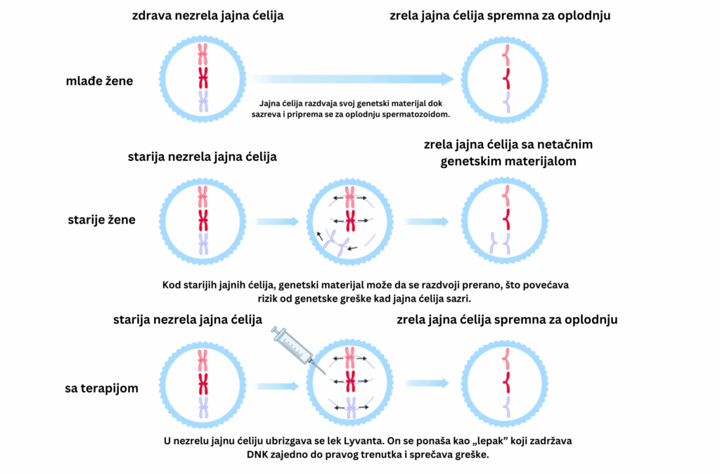 Međutim, lek u razvoju, nazvan Lyvanta, pomaže u zaustavljanju oštećenja jajnih ćelija izazvanih starenjem – što znači da jajne ćelije žena u kasnim 30-im, 40-im, pa čak i u 50-im godinama mogu biti podjednako kvalitetne kao kod žena u 20-im godinama.