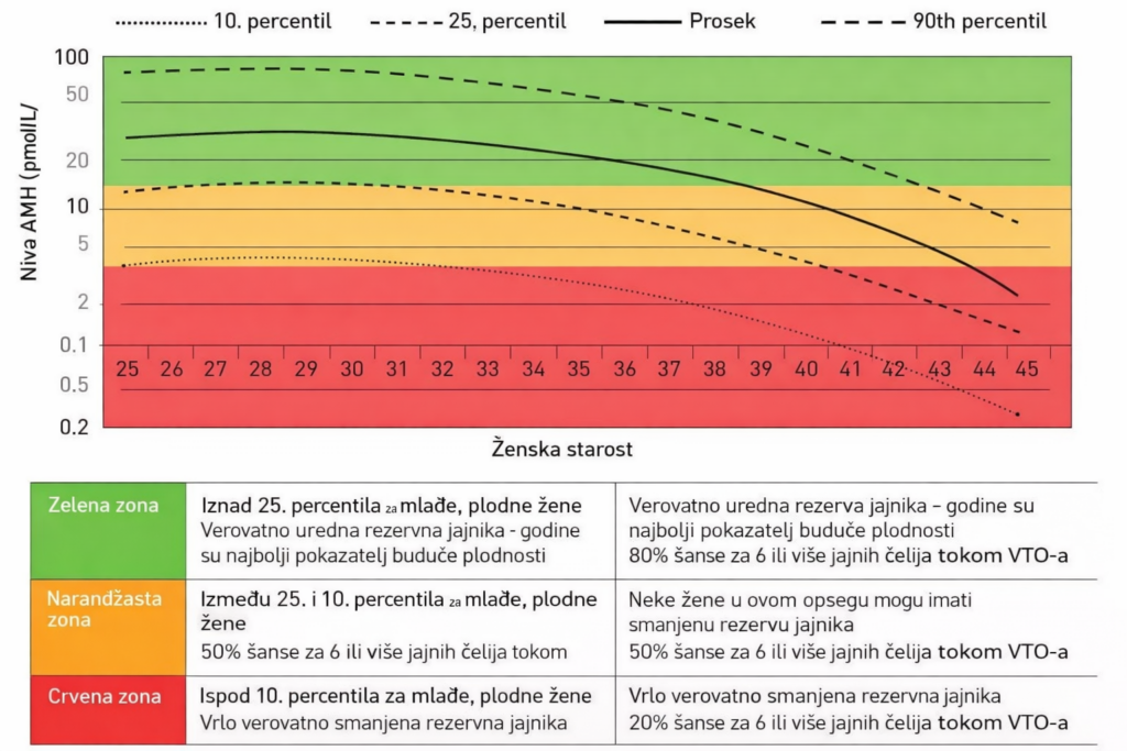 Na grafikonu su označene zone u crvenoj, narandžastoj i zelenoj boji koje prikazuju kakav uticaj vaš AMH ima u odnosu na vaše godine.