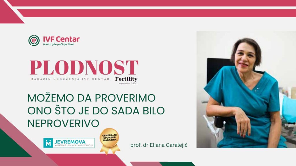 Sagovornica: prof. dr Eliana Garalejić, direktorka Specijalne ginekološke bolnice MediGroup Jevremova Koliko je problem neplodnosti povećan u poslednjih 5 godina? prof. dr Eliana Garalejić: Smanjena rezerva jajnika je danas česta pojava čak i kod mladih žena. To je nekada bila retkost.Globalno gledano, drastično su smanjeni i broj i kvalitet spermatozoida kod muškaraca.Sve ovo zajedno povećava broj parova kojima je potrebna pomoć lekara radi dobijanja potomstva. Koji su najčešći uzroci neplodnosti kod parova? prof. dr Eliana Garalejić: Mnogobrojni su uzroci infertiliteta i oni variraju zavisno od geografske lokacije i socijalno-ekonomske sredine. U ekonomski nerazvijenim zemljma najčešći uzroci infertiliteta su vezani za: U zemljama razvijenog sveta najčešći uzroci infertiliteta su: Čest uzrok infertiliteta je postojanje psiholoških problema čiji je koren najčešće u samoj nemogućnosti žene da ostvari veoma željenu trudnoću, a koji se pojačava i potencira uticajem bliže okoline – rodbine i prijatelja. Naravno, moramo biti svesni činjenice da je infertilitet pretežno multifaktorijalne etiologije i da zbog toga uvek treba težiti sveobuhvatnom i kompletnom ispitivanju oba partnera. Koje su optimalne godine za trudnoću i zašto? prof. dr Eliana Garalejić: Idealno je da se prvo dete rodi do 25. godine života.Sa starošću žene se smanjuje kvalitet jajnih ćelija i plodnost sa jedne strane,
